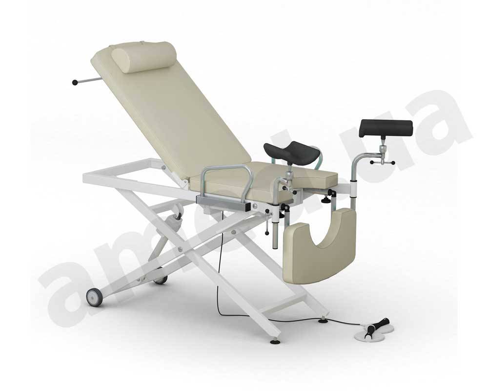 Крісло гінекологічне оглядове з електричним регулюванням висоти сидіння, з розкладними спинкою і секцією для ніг в горизонтальне положення. Каркас крісла гінекологічного виготовлений зі сталевих труб, пофарбованих епокси-поліефірною порошковою фарбою білого кольору з матовою текстурою.